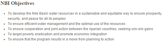 1) To develop the Nile River water resources in a equitable and sustainable manner in order to ensure prosperity, security and peace for the inhabitants.